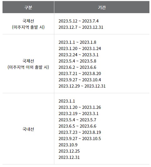 - 한국을 경유하는 이원구간의 경우 편도별 첫 여정의 탑승일을 기준으로 성/평수기가 결정되며 탑승클래스가 다를 경우 최상위 클래스 기준으로 공제됩니다.