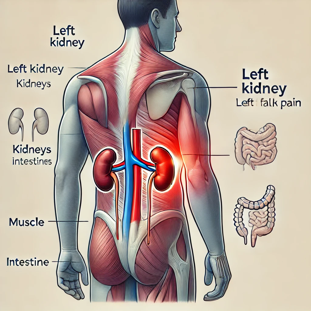 - 요로결석: 소변 속 무기질이 굳어 결석이 되면, 그 돌이 요관을 자극해 심한 통증을 유발합니다. 특히 왼쪽 옆구리 통증과 왼쪽 옆구리 뒤쪽 통증이 날카롭고 찌르듯이 나타나는 것이 특징입니다.